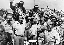 Pódio da prova.Na fileira superior, da esquerda para direita, os pilotos Patrick Depailler (2º Colocado), Niki Lauda (1º Colocado) e Tom Pryce (3º Colocado). Na fileira inferior, da esquerda para direita, o prefeito de São Paulo Olavo Setúbal e o governador do estado de São Paulo Paulo Egydio Martins.