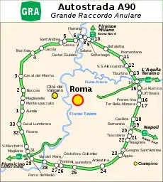 A Auto estrada A90, mais conhecida como Grande Raccordo Anulare (G.R.A.), é uma autoestrada tangencial sem pedágio que circula anularmente o centro da cidade de Roma. Caracterizado de um traçado circular fechado e sem descontinuidade, de mão dupla, com pelo menos três vias de fluxo, possui um diâmetro médio de 21 Km e 68,223 Km de extensão, nela circulam diariamente cerca de 160.000 veículos, o que a põe entre as estradas com mais alto volume de trafego. Juntamente com a tangencial oeste, com as vias consulares e a Via Cristovão Colombo é uma das vias de escoamento mais importantes da Capital Italiana.