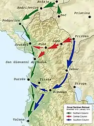 Para escapar do cerco dos invasores, em 23 de novembro de 1915, o governo e o comando supremo tomaram a decisão conjunta de recuar pelas montanhas de Montenegro e da Albânia. O objetivo era chegar à costa do Adriático, onde reorganizariam e reequipariam o Exército Sérvio com a ajuda dos Aliados. Os sérvios então recuaram através das montanhas em três colunas; a retirada levou os remanescentes do exército, o Rei Pedro I da Sérvia, centenas de milhares de refugiados civis, e prisioneiros de guerra. Entre Novembro de 1915 e Janeiro de 1916, durante a viagem através das montanhas, 77.455 soldados e 160.000 civis congelaram, morreram de fome, morreram de doenças ou foram mortos por ataques inimigos. Os pilotos austríacos usaram a nova tecnologia da época, lançando bombas sobre as colunas em retirada, no que foi chamado de “o primeiro bombardeamento aéreo de civis”. [6]