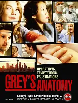 A série foi anunciada no final de 2004 como um substituto no meio da temporada de Boston Legal.[13] Foi originalmente programado para ficar no horário de Boston Legal por apenas quatro semanas, mas depois de receber altas avaliações permaneceu no horário para o restante da temporada.[14] O presidente da ABC Entertainment, Steve McPherson, comentou sobre a decisão do cronograma: "Em última análise, decidimos que, sem ter tempo de vendas ou dinheiro para se dedicar a qualquer programa tão tarde na temporada, continuaríamos a deixar Grey's crescer até maio".[15] Antes da transmissão, foi anunciado que o título do programa mudaria de Grey's Anatomy para Complications, embora no final isso não tenha acontecido.[16] Francie Calfo, vice-presidente executivo de desenvolvimento da ABC Entertainment, comentou sobre a concepção do programa: "Eu acho que havia uma necessidade para este tipo de série no ar, especificamente uma série médica. E Shonda encontrou uma reviravolta que o tornou perfeito para onde estamos agora. "Os programas médicos são difíceis, e foi difícil tentar descobrir onde a nossa poderia ser diferente. Mas onde todo mundo está acelerando seus programas médicos, ela encontrou uma maneira de desacelerar, para você conheça os personagens. Há definitivamente um apelo feminino forte para isso."[14] Rhimes explicou que ela havia achado a ideia interessante de um programa sobre mulheres inteligentes competindo entre si.[14]