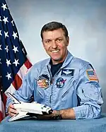 T. Kenneth Mattingly II | 17 de março de 1936 | Nascido em Chicago, Illinois, formou-se em 1958 com um bacharelato em engenharia aeronáutica pela Universidade de Auburn e entrou na Marinha. Formou-se na Escola Experimental de Pilotos de Teste em 1965 e na Escola de Pilotos de Pesquisa Aeroespacial no ano seguinte. Foi originalmente designado como o piloto do módulo de comando da Apollo 13, porém foi removido da tripulação três dias antes do lançamento por ter sido exposto a rubéola. Foi para o espaço a primeira vez em abril de 1972 como piloto do módulo de comando da Apollo 16, realizando uma atividade extraveicular de uma hora em espaço profundo. De 1973 a 1978 trabalhou no Escritório dos Astronautas em apoio ao programa Sistema de Transporte Espacial, depois gerente do Programa de Teste de Voos Orbitais entre 1978 e 1979 e chefiou o grupo de ascensão/entrada do Escritório dos Astronautas até 1981. Retornou ao espaço em junho de 1982 a bordo do Columbia como comandante da STS-4, o último voo teste do ônibus espacial. Em janeiro de 1985 comandou a STS-51-C no Discovery, a primeira missão com um carregamento do Departamento de Defesa dos Estados Unidos. Aposentou-se da NASA e da Marinha em 1985. | [12] | |