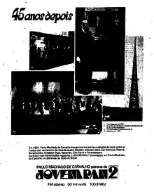 A emissora, em 1976, preparava-se para uma nova mudança de endereço, dessa vez para o número 807, no edifício Sir Winston Churchill, localizado na já movimentada Avenida Paulista.[5][13][8] Com a mudança, foi inaugurada a nova antena transmissora da rádio, no topo do edifício, e no dia 1 de julho de 1976, a Jovem Pan 2, na frequência de 100.9 MHz.[16] O projeto que foi executado pelo filho de Tuta, Antônio Augusto Amaral de Carvalho Filho, o Tutinha.[5][8][12] Assim, Tuta tomava conta da programação da rádio AM, enquanto seu filho formatava o que seria a rádio FM.[12]