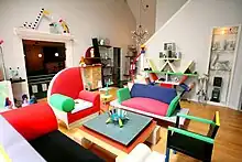 Durante seus anos de atividade, o grupo Memphis projetou uma série de móveis não conformistas. Entre seus designs mais populares e conhecidos está o "Carlton" Room Divider, um totem que incorpora uma variedade de cores brilhantes, formas sólidas e vazios. A estrutura foi construída com laminados de plástico baratos, apesar de ser destinada a um mercado de luxo, e inclui uma série de triângulos equiláteros, reais e implícitos.[5]
