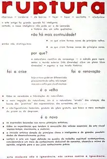 Grupo Ruptura foi um conjunto de artistas que marcou o início do movimento de arte concreta em São Paulo, no Brasil.[1] Criado em 1952, era liderado por Waldemar Cordeiro (também seu maior teórico) e composto, inicialmente, por Geraldo de Barros, Luís Sacilotto, Lothar Charoux, Kazmer Féjer, Anatol Wladyslaw e Leopold Haar.[2] Em seu manifesto, é proposta a “renovação dos valores essenciais das artes visuais” através das pesquisas geométricas, aproximando arte e indústria, e com o desligamento da tradição abstracionista passada.[1]