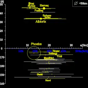 A União Astronômica Internacional (UAI) usa nomes tirados da mitologia nórdica para nomear as luas desse grupo. A única exceção é Febe, que foi nomeado antes da criação dessa convenção de nomenclatura.