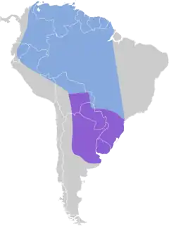 Pode ser encontrada nos seguintes países: Argentina, Aruba, Bolívia, Brasil, Colômbia, Equador, Guiana Francesa, Guiana, Antilhas Holandesas, Paraguai, Peru, Suriname, Trinidad e Tobago, Uruguai e Venezuela.[1]