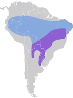 Pode ser encontrada nos seguintes países: Argentina, Bolívia, Brasil, Colômbia, Equador, Paraguai, Peru e Uruguai.[1]