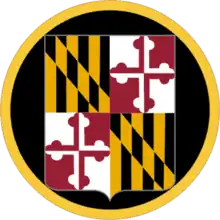 - Descrição: Em um disco preto 23⁄4 polegadas (6,99 cm) de diâmetro dentro de 1/8 polegada (0,32 cm) borda dourada, o escudo do Grande Selo de Maryland Própria (1º e 4º quartéis, amarelo e preto; 2º e 3º quartéis, branco e vermelho).