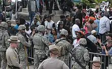 Guardas Nacionais do Exército de Maryland assistindo a manifestantes reunidos em frente à Prefeitura de Baltimore, 30 de abril de 2015 - Destacamento Médico