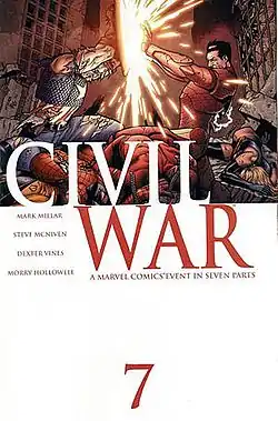![]() Capa de Civil War 7 (Jan 2007). Arte de Steve McNiven. | |