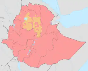 ![]() Mapa da Etiópia mostrando áreas de presença da milícia Fano (em amarelo) e áreas sob controle do governo etíope (em rosa). | |||