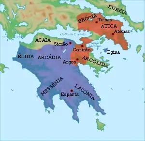 Também lutou contra Fliunte e Arcádia, derrotando decisivamente os primeiros e saqueando os territórios dos arcádios, quando estes evitaram o confronto frente a frente com suas tropas.[26]