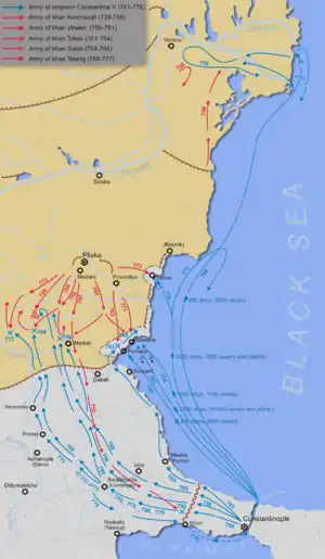 Em sua primeira campanha, em 756, Constantino conseguiu derrotar os búlgaros por duas vezes, mas, três anos depois, Vineque derrotou decisivamente o exército bizantino na Batalha do Passo de Rishki[3] e logo tentou a paz, mas acabou assassinado pelos nobres búlgaros. O novo governante, Teletzes, foi derrotado na Batalha de Anquíalo em 763.[4] Em suas campanhas subsequentes, nenhum dos lados conseguiu conquistar ganhos importantes, pois os bizantinos não conseguiram atravessar a cordilheira dos Bálcãs e a sua frota foi destruída por duas vezes em tempestades (2 600 naus foram afundadas somente na de 756[5][6]). Em 774, eles derrotaram uma força búlgara muito inferior em Berzitia, mas esta seria a última vitória de Constantino V: por causa das sucessivas derrotas, os búlgaros criaram uma artimanha para revelar os espiões bizantinos em Plisca. O cã Telerigue enviou um emissário em segredo até Constantino V indicando sua (falsa) intenção de fugir da Bulgária para buscar refúgio com o imperador e queria se assegurar que seria bem recebido. Para conseguir o feito, o imperador revelou quem eram os seus agentes na Bulgária, que foram imediatamente presos e executados. Como Constantino morreu em 775, a esperada retaliação bizantina não se materializou.