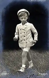 No seu 10º aniversário, comemorado em 1916, Guilherme foi nomeado tenente do 1º Regimento de Guardas e foi-lhe dada a Ordem da Águia Negra pelo seu avô. Dois anos depois, quando ele tinha apenas 12 anos, a monarquia alemã foi abolida. Guilherme e a família permaneceram na Alemanha apesar de o seu avô ser enviado para o exílio na Holanda. O antigo príncipe-herdeiro e a sua família permaneceram em Potsdam onde Guilherme e os seus irmãos mais novos frequentaram a escola local.