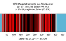 Representação gráfica das páginas da tese de Karl-Theodor zu Guttenberg, que de acordo com a Guttenplag Wiki são plagiadas (situação em 3 de abril de 2011)