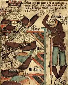 As três figuras sentam-se em três tronos; Alto (Hár, High) no mais baixo, Segundo-depois-do-Alto (Jafnhár, Just-As-High) no meio, e Terceiro (Þriðji, Third) no mais alto.