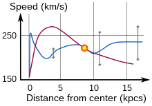 A presença de matéria escura no halo é inferida de seu efeito gravitacional na curva de rotação de uma galáxia espiral. Sem grandes quantidades de massa em todo o halo (aproximadamente esférico), a velocidade rotacional da galáxia diminuiria em grandes distâncias do centro galáctico, assim como as velocidades orbitais dos planetas externos diminuem com a distância do sol. No entanto, observações de galáxias espirais, particularmente observações de emissão de rádio do gás de hidrogênio neutro (conhecido como linha de hidrogênio de 21 cm e linha HI), mostram que a curva de rotação da maioria das galáxias espirais se achata, o que significa que as velocidades de rotação não diminuem com a distância do centro galáctico.[11] A ausência de qualquer matéria visível para explicar essas observações implica na existência de uma matéria não observada (escura), proposta pela primeira vez por Ken Freeman em 1970, ou que a teoria da Relatividade Geral está incompleta. Freeman percebeu que o declínio esperado na velocidade não estava presente em NGC 300 nem em M33, considerando então uma massa não detectada para explicar o fenômeno. A hipótese de DM foi reforçada por vários estudos.[12][13]