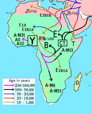 De acordo com a versão 8.75, de 6 Setembro de 2013, da Sociedade Internacional de Genealogia Genética (ISOGG), a ramificação que separa A0-P305 de A1-V161, pode ter ocorrido há cerca de 140 mil anos. Os haplogroupos A0-P305, A1a M31 e A1b1a-M14 encontram-se em África e o A1b1b-M32 é mais frequente em África. O haplogrupo que seria classificado como A1b2 é composto pelos haplogrupos de B a T. A ramificação interna do haplogrupo A1-V161 em A1a-M31, A1b1 e BT (A1b2) pode ter ocorrido há cerca de 110.000 anos. O A0-P305 é pouco frequente na África Central e Ocidental. O A1a-M31 é mais frequente no noroeste africano. O A1b1a-M14 é frequente nas populações que falam línguas khoisan. O A1b1b-M32 tem uma distribuição mais ampla; desde as população de língua Khoisan, no sul, a populações do Leste Africano bem como fora do continente africano entre populações dispersas na Península Arábica.