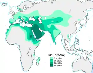 - As linhagens J1 podem ter uma origem mais ao sul, como são mais freqüentemente encontrados na região do Levante, em outras partes do Oriente Médio e Norte da África, com uma distribuição esparsa no flanco sul do Mediterrâneo da Europa, e na Etiópia.