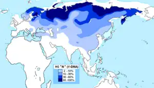 | Alta frequência | Iacutos 75%, Nenets 75%, Finlandeses 60%, Países Bálticos 45% (McDonald 2005), Lapões 40%, Russos 20% (Malyarchuk 2004) |
