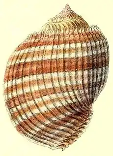 Ilustração com a vista superior de uma concha do molusco Harpidae Harpa costata (Linnaeus, 1758)[1] (antes Harpa imperialis), encontrada em ilhas do sudoeste do oceano Índico.[3] Retirada de Conchologia Iconica (1843), Vol. 1, Pl. II. | |||||||||||||||||||