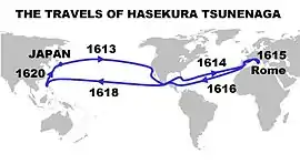 Entre os anos de 1613 e 1620, Hasekura chefiou uma missão diplomática no Vaticano, em Roma, viajando pela Nova Espanha (chegando em Acapulco e saindo de Veracruz) e visitando vários lugares da Europa. A missão histórica é denominada Embaixada Keichō (慶長使節), e segue a embaixada Tenshō (天正使節) de 1582.[3] Na viagem de volta, Hasekura e seus companheiros re-traçaram sua rota através do México em 1619, navegando de Acapulco até Manila, e então navegando ao norte para o Japão em 1620.[4] Ele é convencionalmente considerado o primeiro embaixador japonês das Américas e da Europa.[5]