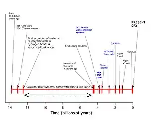 Hemolitina é o nome dado a uma molécula de proteína isolada de dois meteoritos CV3, Allende e Acfer-086. Sua proporção de deutério para hidrogênio é 26 vezes maior que a terrestre, o que é consistente com o fato de ter se formado em uma nuvem molecular interestelar, ou posteriormente no disco protoplanetário no início de nosso sistema solar há 4,567 bilhões de anos. Os elementos hidrogênio, lítio, carbono, oxigênio, nitrogênio e ferro de que é composto estavam todos disponíveis pela primeira vez 13 bilhões de anos atrás, depois que a primeira geração de estrelas massivas terminou em eventos nucleossintéticos. A seta horizontal no gráfico de linha do tempo abaixo mostra, na escala do início do Universo até o presente, quando a Hemolitina poderia ter se formado e se reformado.