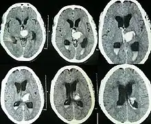 Hemorragia intracerebral espontânea com hidrocefalia na tomografia computadorizada[6]