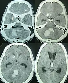 Tomografia axial mostrando hemorragia na fossa posterior[6]