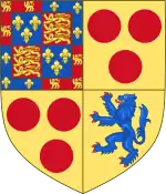 Brasão de Henry Courtenay, 1.º Conde de Devon, KG: Trimestral, 1.º: brasão reais da Inglaterra (para seu sogro Rei Eduardo IV), dentro de uma borda contrária alterada; 2 e 3: Courtenay; 4: Redvers