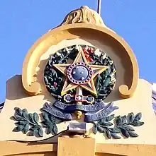 O Brasão foi instituído pelo Decreto nº 4 de 19 de novembro de 1889, e posteriormente ajustado por outras leis. Segundo o texto da legislação, "o escudo redondo será constituído em campo azul-celeste, contendo cinco estrelas de prata, dispostas na forma da constelação do Cruzeiro do Sul, com a bordadura do campo perfilada de ouro, carregada de estrelas de prata em número igual ao das estrelas existentes na bandeira nacional; o escudo ficará pousado numa estrela partida e gironada, de dez peças de sinopla (verde) e ouro, bordada de duas tiras, a interior de goles (vermelho) e a exterior de ouro; o todo brocante sobre uma espada, em pala, empunhada de ouro, guardas de blau (azul), salvo a parte do centro, que é de goles e contendo uma estrela de prata, figurará sobre uma coroa formada de um ramo de café frutificado, à destra, e de outro de fumo florido, à sinistra, ambos da própria cor, atados de blau, ficando o conjunto sobre um resplendor de ouro, cujos contornos formam uma estrela de vinte pontas; em listel de blau, brocante sobre os punhos da espada, inscrever-se-á, em ouro, a legenda República Federativa do Brasil, no centro, e ainda as expressões 15 de novembro, na extremidade destra, e as expressões de 1889, na sinistra".[45]