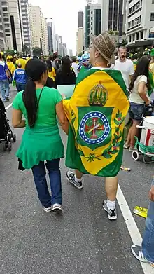Em 1928 surgia o movimento monárquico patrianovista, ativo até fins da década de 1930, com uma pauta fortemente reacionária e beligerante, assumidamente de "extrema direita radical e violenta", conforme é dito em seu manifesto publicado por Arlindo Veiga dos Santos, e fazendo extenso uso da simbologia imperial.[102][96] A partir de 1960 destacou-se por muitos anos a organização Tradição, Família e Propriedade (TFP), fundada por Plinio Corrêa de Oliveira como um movimento profético, escatológico, reacionário, monárquico e medievalista, altamente ritualizado, onde a heráldica ocupou lugar de destaque. Durante a ditadura militar teve uma grande expansão e ganhou significativo prestígio por suas obras assistencialistas. Membros da família imperial, Dom Luiz Gastão de Orléans e Bragança e seu irmão Dom Bertrand de Orléans e Bragança, aderiram ao movimento.[103][104] Muito militante, segundo o Memorial da Democracia "seus membros desfilavam pelas ruas levando grandes estandartes vermelhos, com símbolos e brasões medievais. Seriam comuns os confrontos entre simpatizantes da esquerda e a sua brigada, que tinha ordens para atacar, jamais recuar". Depois da morte de Oliveira em 1995, a entidade perdeu muita força.[97] Depois o monarquismo permaneceu parte da agenda de diferentes grupos, instituições privadas e movimentos políticos, como o Instituto Brasil Imperial, o Círculo Monárquico Brasileiro, a Causa Imperial e outros.[105]