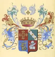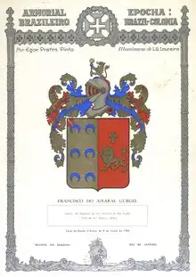 Outra novidade introduzida por D. Pedro I foi uma nova nobreza portadora de títulos com características diferentes da portuguesa. Nobres portugueses podiam transmitir seus títulos e armas à descendência, mas no Brasil a nobreza titulada não era hereditária e o uso do brasão cessava com a morte do seu titular, salvo por especial concessão.[23] Brasões não vinham anexos aos títulos brasileiros, eram dois processos separados, e para ter brasão era necessário fazer um requerimento à Coroa, pagando-se um valor substancial para seu registro no Cartório da Nobreza. O uso de armas era estritamente regulamentado e a usurpação era punível com a prisão. Em 1830 o rei de armas Félix José da Silva publicou nota na imprensa prevenindo que a ninguém seria permitido "usar de brasão de armas em selos, reposteiros, carruagens, ou quaisquer outros trastes, ou tê-los esculpidos na frente das suas casas, ou outras partes, sem que se apresentem cartas de brasão, que lhes faculte o seu uso, sendo as cartas passadas pelo competente escrivão da nobreza e fidalguia",[24] mas muitos abusos e falsificações ocorreram, especialmente na atribuição de armas novas usando armas da antiga fidalguia portuguesa a pessoas de mesmo sobrenome, mas cujo parentesco com as casas metropolitanas nunca foi comprovado.[25]