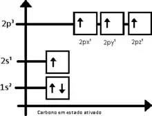 Dessa forma, o carbono deveria realizar apenas duas ligações, ao que há apenas dois orbitais semipreenchidos. O primeiro passo para se entender o processo de hibridação, é excitar o átomo de carbono em questão, passando o elétron do orbital 2s para o 2p: