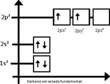 A configuração eletrônica do carbono no estado fundamental é 1s2 2s2 2p2, e nesta configuração seriam possíveis apenas duas ligações covalentes, uma vez que existem apenas dois elétrons desemparelhados. Entretanto, a molécula de metileno (CH2) é extremamente reativa e não é estável. Para explicar a tetravalência do carbono, é usado o recurso da hibridização, "somando" as funções de onda dos orbitais 2s e 2p, resultando em orbitais híbridos.