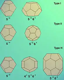 Hidratos de gás usualmente formam duas estruturas cristalográficas cúbicas — estrutura (Tipo) I estrutura (Tipo) II[5] de grupos espaciais and respectively. Raramente, uma terceira estrutura hexagonal de grupo espacial pode ser observado (Tipo H).[6]
