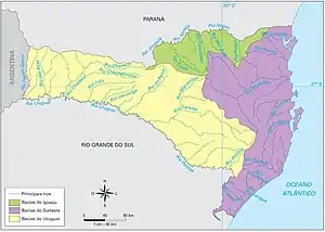 No interior do estado, duas bacias juntam-se para compor a bacia da Prata: a do Paraná, cujo afluente mais importante é o rio Iguaçu, e a do Uruguai. Este tem como afluentes principais os rios Pelotas, Canoas, Chapecó e do Peixe.[1]