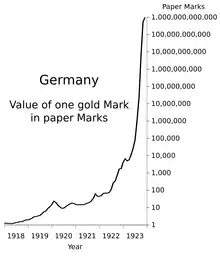 Entre janeiro de 1922 e dezembro de 1923 a taxa acumulada de inflação ascendeu a um bilhão por cento. Em outubro de 1923 o aumento de preços chegou ao ápice, atingindo a taxa de 29,5 mil por cento ao mês, ou 20,9% ao dia.[4]