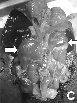Exame de um bebê após sua morte. As setas indicam as supra-renais hiperplásicas.