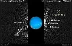 ![]() Imagem composta mostrando Netuno, seus anéis, Hipocampo, e alguns outros satélites internos | |
