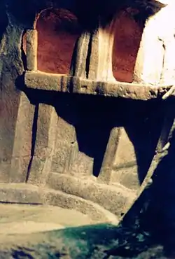 É uma espaçosa sala circular de paredes lisas e inclinadas, ricamente decoradas com desenhos geométricos. À direita da entrada há uma mão escavada na rocha.