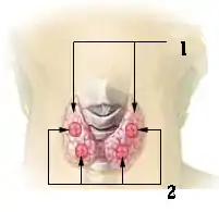 As glândulas rosas (1) são as tireóides e os círculos vermelhos (2) indicam as paratireóides.