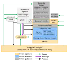 A partir de então o Conselho Maior se firmou como o órgão de base da república, assim permanecendo até a extinção do Estado no século XVIII, sendo a fonte de grande parte das leis e a origem primária de todas as outras magistraturas, continuando a eleger o doge, que se tornava, porém, figura quase apenas simbólica e cerimonial. Em 1310 era criado o Conselho dos Dez (Consiglio dei Dieci), órgão de polícia encarregado de manter a ordem, a segurança e a moralidade pública, atuar como polícia secreta e órgão de censura, e como tribunal para casos de abuso de poder e corrupção dos nobres.[4][21] A partir de 1335 o Conselho dos Dez adquire caráter permanente e o Senado ganha crescente peso nas decisões mais importantes.[22]