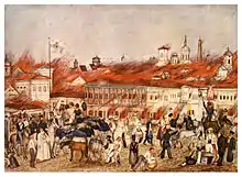 Quando a ocupação russa terminou em 1834, o trono do principado foi ocupado por Alexandre II Ghica (r.1834 1842). Durante o seu primeiro mandato, que durou até 1842, a concessão de direitos comerciais aos Principados e a integração de Brăila na Valáquia assegurou um renascimento económico.[72] Foram pavimentadas mais ruas e foi construído um novo palácio principesco, que depois seria substituído pelo muito maior palácio real, onde atualmente está alojado o Museu Nacional da Roménia.[73][74] A cidade foi afetada por um sismo de pouca gravidade em janeiro de 1838 e por uma grande cheia em março de 1839.[75]