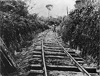 Em 1938 o projeto foi retomado, pois tornava-se economicamente viável novamente, principalmente graças ao auge vivenciado pelos ciclos da castanha e do diamante em Marabá, e o ressurgimento da exploração do caucho na região em 1939, incentivado pelo estado de guerra. Em 1944 a ferrovia é concluída, ligando Alcobaça a Jatobal, transpondo totalmente as corredeiras do Itaboca.[60] Em 1973 um decreto federal extingue a ferrovia, e decreta que esta seja substituída por uma rodovia. Desde a década de 1980 a área da ferrovia encontra-se submersa pelo lago da Hidrelétrica de Tucuruí.