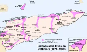 Em 7 de Dezembro de 1975 Timor-Leste foi invadido pela Indonésia que a ocupou durante os 24 anos seguintes.[5] Timor mergulhou na violência fratricida e o governador Mário Lemos Pires, destituído de orientações precisas de Lisboa e sem forças militares suficientes para reimpor a autoridade portuguesa, abandonou a capital e refugiou-se na ilha de Ataúro, que fica de frente para a cidade de Díli (atual capital de Timor-Leste).