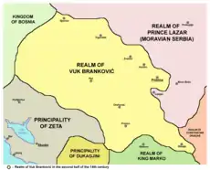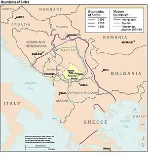 A Primeira Batalha de Kosovo ocorreu no campo de Kosovo Polje em 28 de junho de 1389, quando o cnezo ("príncipe") da Sérvia, Lázaro Hrebeljanović, formou uma coalizão de soldados cristãos, composta de sérvios, mas com pequenos números também de sérvios bósnios, albaneses, búlgaros, magiares e uma tropa de mercenários saxões. O Sultão Murade I também reuniu uma coalizão de soldados e voluntários dos países vizinhos na Anatólia e Rumélia. Os números exatos são difíceis de encontrar, mas relatos históricos mais confiáveis sugerem que o exército cristão foi fortemente superado em número pelo otomano. [carece de fontes] Os números combinados dos dois exércitos pode ter sido inferior a 100.000. O exército sérvio foi derrotado e Lazar foi morto, embora Murade tenha sido assassinado por Miloš Obilic. Embora a batalha foi mitificada como uma grande derrota da Sérvia, na época a opinião estava dividida sobre se foi uma derrota da Sérvia, um empate ou possivelmente até mesmo uma vitória sérvia; pois, a Sérvia manteve a sua independência e controle esporádico de Kosovo até a derrota final em 1455, e findo o qual, a Sérvia se tornou parte do Império Otomano. A fortaleza de Novo Brdo, importante no momento devido ao suas ricas minas de prata, ficou sob cerco durante 40 dias pelos otomanos durante esse ano, capitulando e tornando-se ocupada pelos otomanos em 1 de junho de 1455.