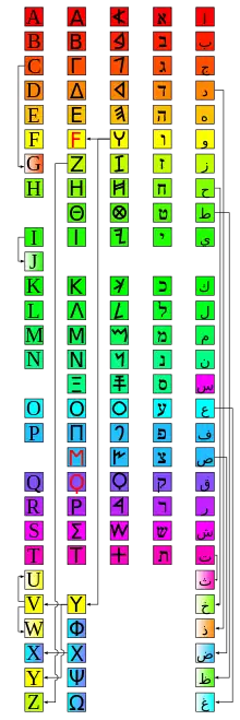 A tabela mostra como o alfabeto se espalhou para o oeste (grego, latim) e para o leste (brami, coreano); a correspondência exata entre o fenício (através do aramaico) ao brami, no entanto, é incerta, especialmente devido às sibilantes e às letras entre parênteses. A transmissão do alfabeto do tibetano (através do 'phags-pa) para o hangul também é controversa.