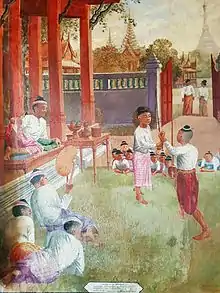Nai Khanomtom foi prisioneiro de guerra capturado pelos birmaneses quando Ayutthaya foi saqueada pela segunda vez. Em 1774, o rei da Birmânia, Angwa, realizou uma celebração para a Grande Pagoda em Rangoon. O muay thai foi incluído nas celebrações. Pugilistas tailandeses foram convidados para confrontar lutadores birmaneses. No dia 17 de março do mesmo ano, Nai Khanomtom combateu e derrotou 10 lutadores da Birmânia sucessivamente sem qualquer tempo de descanso entre as partidas.[2] Esta seria a primeira vez que o muay thai seria empregue sobre qualquer competição fora do seu país de origem. Pelas suas realizações, Nai Khanomtom foi homenageado como o "pai do muay thai" ou o "criador do muay thai". Este acontecimento fomentou ao feriado nacional dedicado ao "Dia do Muay Thai".[3]