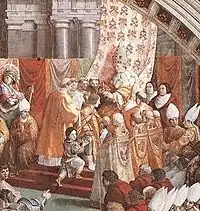 No final do mesmo século, buscando proteção contra os lombardos, o Papa Estevão II apelou para os francos para proteger a Igreja,[55] Pepino, o Breve subjugou os lombardos e doou terras italianas ao papa, formando então os Estados Pontifícios, que se tornaram o Estado da Igreja.[55] Quando o Papa Leão III coroou Carlos Magno (800), os próximos imperadores passaram a ser ungidos por um papa.[55] Carlos Magno conjuntamente com a Igreja inicia uma importante reforma educacional e artística, conhecida como Renascimento carolíngio.[carece de fontes]